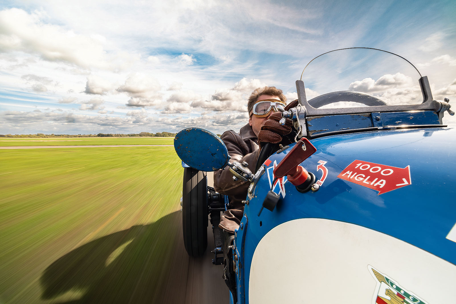 Wir befinden uns auf der Strecke von Bicester Motion, wo sich auf einem ehemaligen Gelände der Royal Airforce mehr als 50 Unternehmen um die Restaurierung von Oldtimern kümmern. Ein grandioses Ambiente: Die Geräusche, Gerüche und das Fahrgefühl des Riley Brokklands wirken, als gehörten sie immer hierhin und wirken keineswegs anachronistisch. Es liegt ein leichter Nebel über dem Areal und im Hintergrund landet gerade etwas wackelig ein historisches de Havilland Moth-Schulflugzeug.