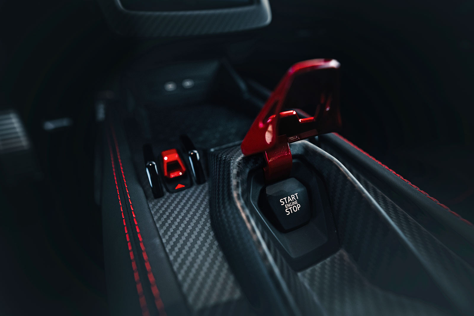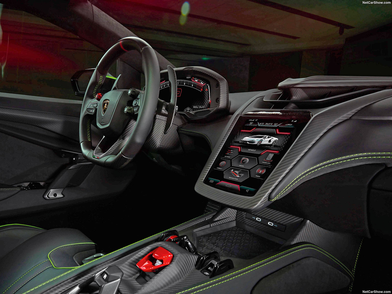 Doch das sollte die Passagiere nicht grämen, die umhüllt werden von einer Carbon-Landschaft, die nur von Leder und Displays unterbrochen wird. Von letzteren gibt es mittlerweile drei: eine zentrale Info-Anzeige für den Fahrer, ein opulentes Display in der Mittelkonsole, wo früher Dutzende Schalter und Tasten geparkt waren, und noch ein drittes vor dem Beifahrer respektive der Beifahrerin, um annähernd im Blick zu behalten, wie nah man der Lichtgeschwindigkeit gekommen ist. Warp 10? Auch wenn der Revuelto nicht zur »Enterprise« aufschließen kann, das Cockpit wirkt wie Science-Fiction.